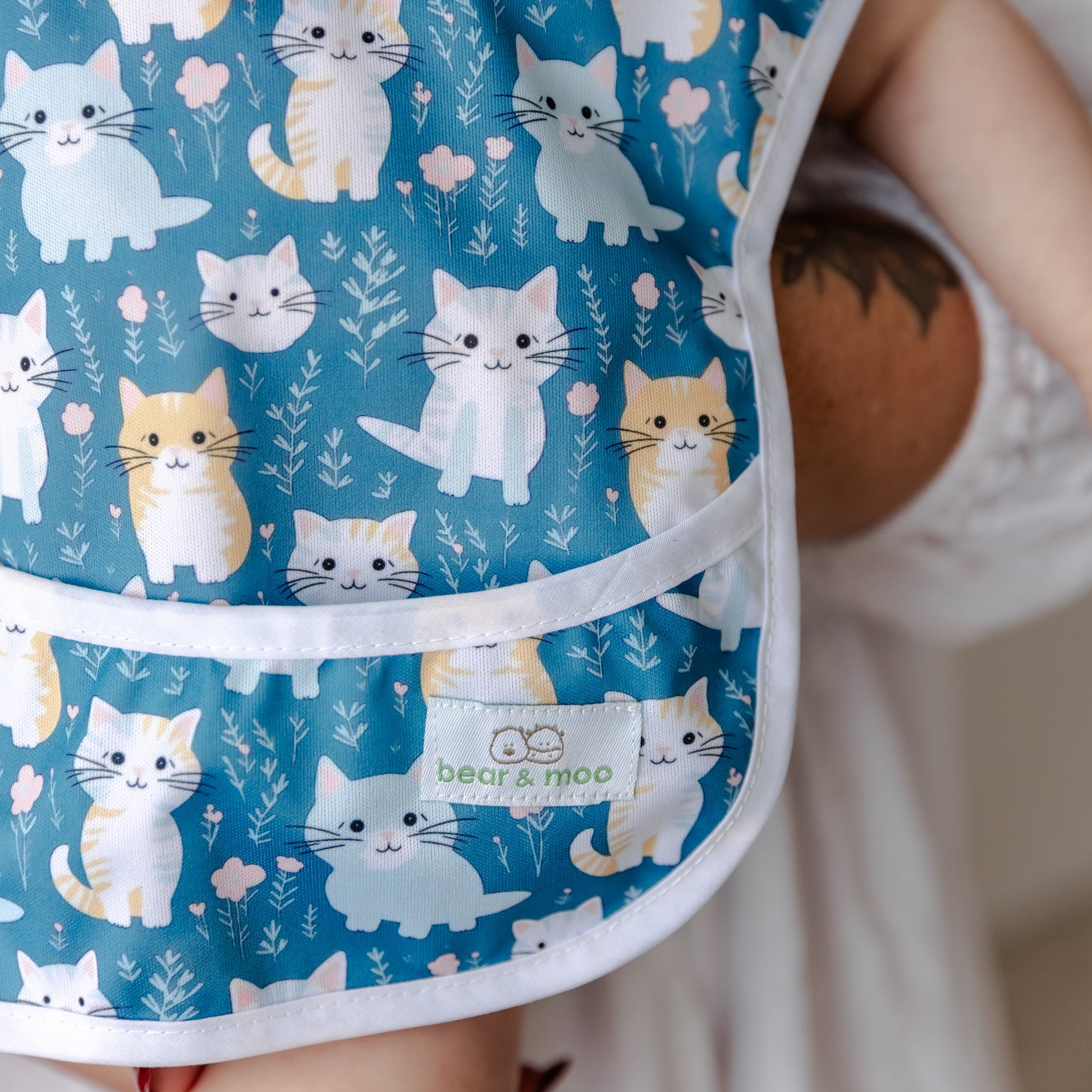 Bear & Moo Classic Bibs are in the same wipeable material as our Sleeved Bibs but in a traditional style. Velcro fastening at the back for quick closing and a pocket at the front for catching mess.