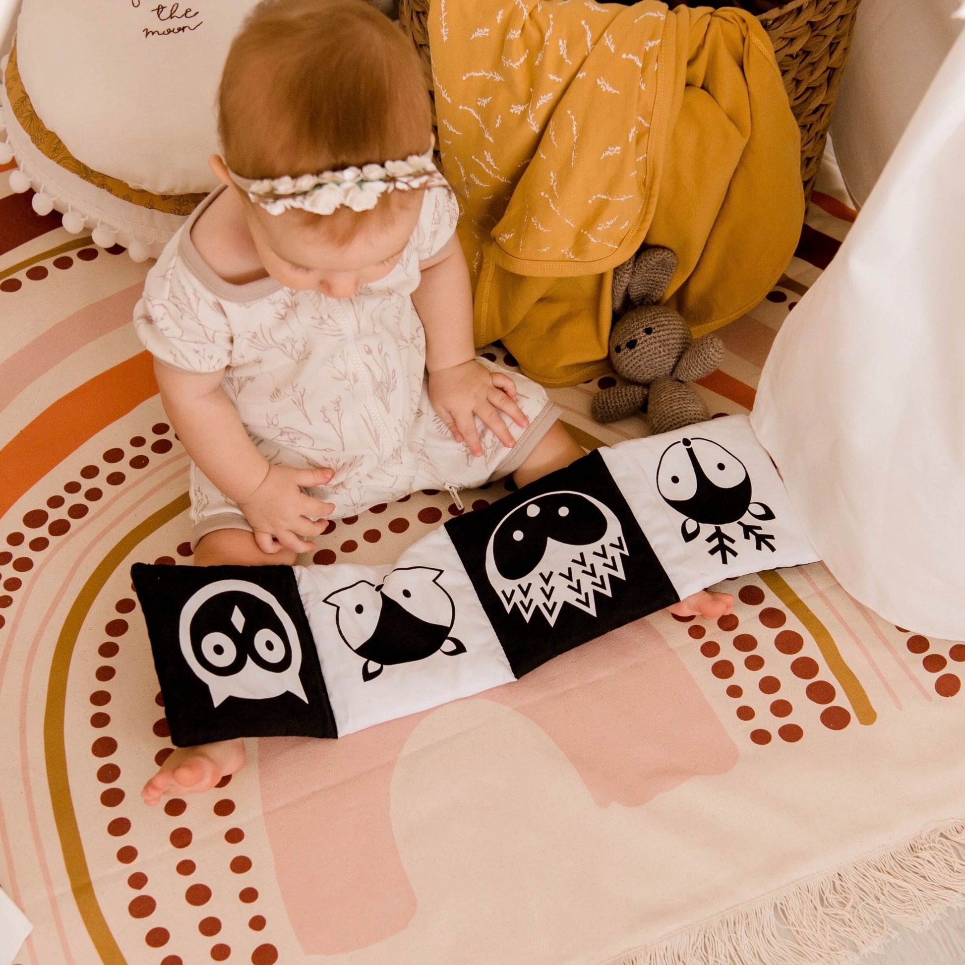 This luxe cotton fold out book is designed for little hands and developing eyes to explore. Featuring all your favourite animals & creatures in these double sided books, baby will love engaging and connecting with the wider worlds in their first soft book.